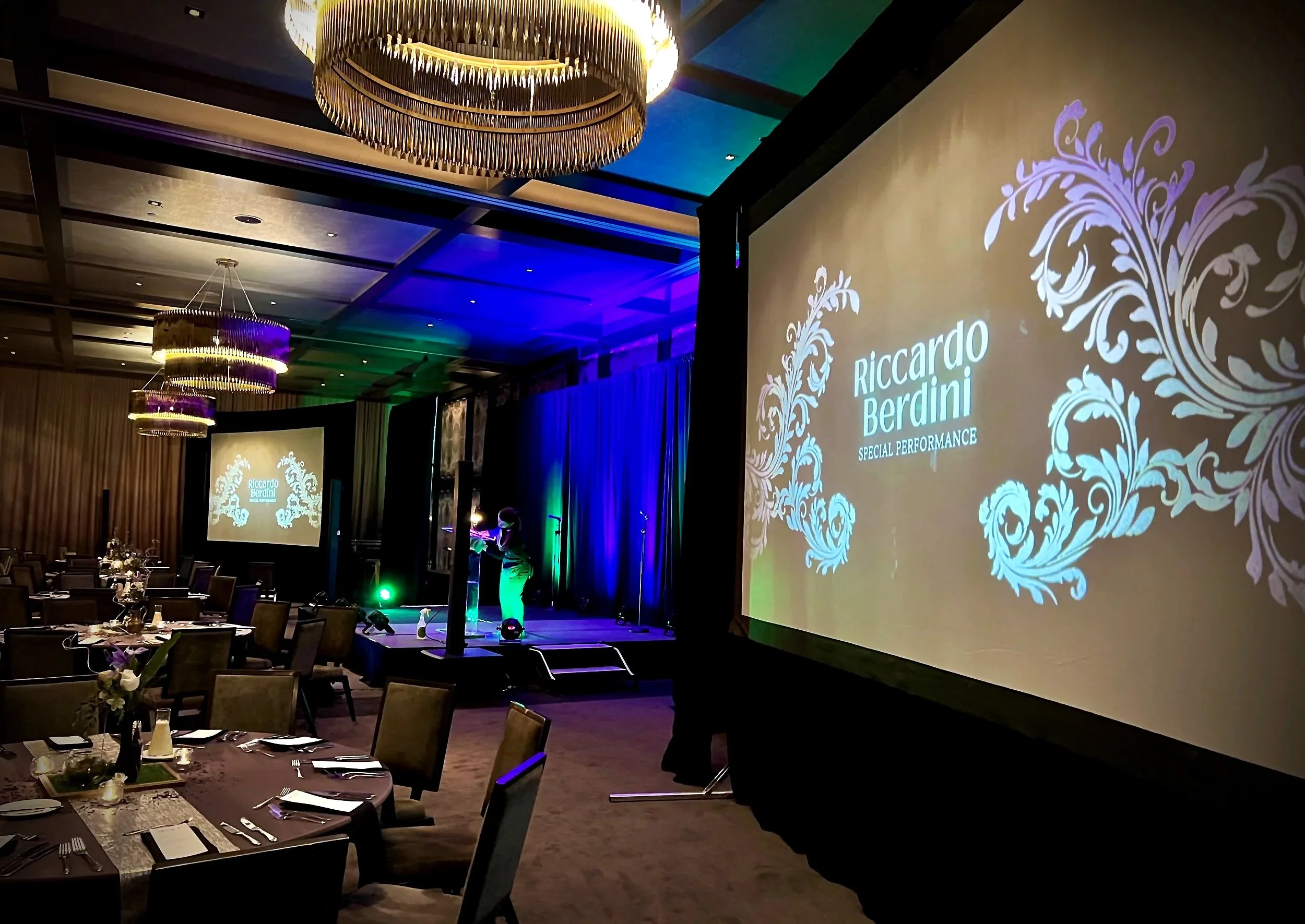 A stage show is presented for the room as a whole, creating one shared experience for all the guests at once. Strolling entertainment happens more informally, with Riccardo moving from group to group. A stage show is ideal when you want a true centerpiece moment.